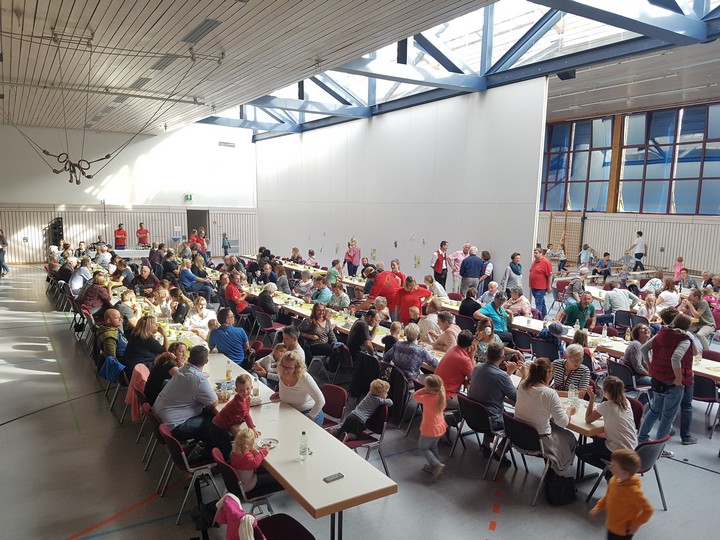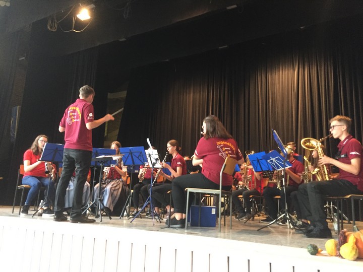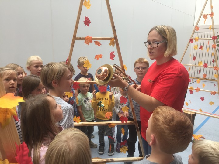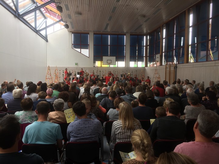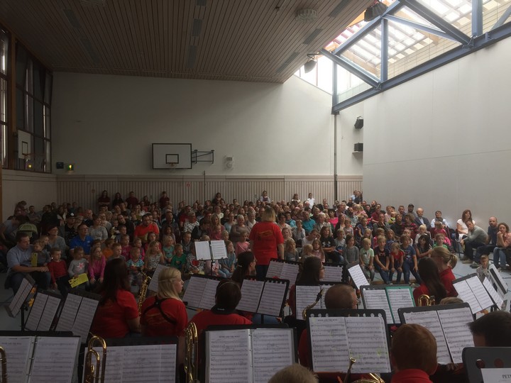 Keinen freien Sitzplatz gab es in der Turn- und Festhalle mehr, als die Musikgesellschaft das musikalische Märchen „Peter und der Wolf“ am Sonntag, den 22.09. aufführte. Den vielen großen und kleinen Zuhörern wurden zuerst die Instrumente und ihre Rollen in dem Stück nähergebracht. Dabei durfte sogar der Trompetendämpfer aus nächster Nähe betrachtet werden, der später den Klang einer Ente erzeugte. Die Kinder hingen gespannt an den Lippen von Dirigentin Monika Wagner, die nach der Vorstellungsrunde die Moderation an Sarah Deussen weitergab. So wurde die Geschichte von Peter und seinen tierischen Freunden erzählt, umrahmt durch die vielen Zwischenspiele der Musikanten. Durch die freistehende, rundum einsehbare Bühne, wurde eine besondere Bindung zwischen der Geschichte und den zahlreichen Zuhörern aufgebaut. Außerdem wurden aufwendig illustrierte Programmhefte verteilt, um das Märchen noch einmal daheim im Kinderzimmer aufleben zu lassen.